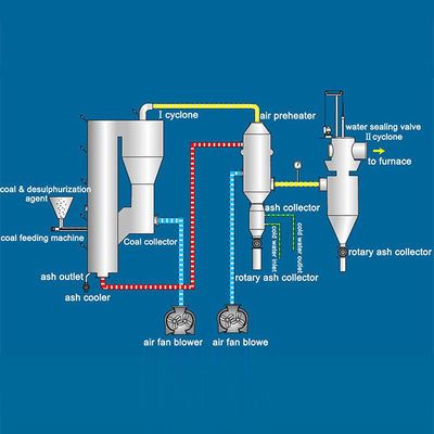 de grondstof wordt via het voersysteem in de vergasser gevoerd om een pyrolyse- en vergassingsreactie te hebben met het kleine volume lucht dat vanuit de bodem van de vergasser wordt binnengebracht.De opgewekte energie kan helpen bij het handhaven van de stabiele reactie binnen en de omzetting van de grondstof in brandstofgas en semicokeHet geproduceerde brandstofgas wordt via de cyclone-separator verzameld voor gebruik in de volgende stap. The large amount of semicoke which is not fully reacted will be carried outside of the gasifier and resent to the gasifier by the return feeder for further reaction after separation through the primary cyclone separatorDe as die niet door de primaire cyclone-separator is gescheiden, wordt door de secundaire cyclone-separator en het zakfilter opgevangen en door het asontladingssysteem afgevoerd.De gezonde vergassingsconditie en de verblijfstijd van de grondstof in de vergassingsmachine kunnen worden gewaarborgd omdat we een wetenschappelijk ontwerp hebben van de diameter van de vergassingsmachineDe grondstof wordt dus efficiënt omgezet in het brandstofgas dat we nodig hebben.